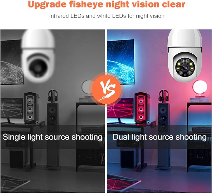 Motion Detection + Real-Time Alerts: This WiFi Security camera and adopts 4pcs IR LEDs and 4pcs white-light LEDs which even at night, Intelligent Night Vision provides ordinary night vision and color night vision, Camera Bulb Security Camera System Adopts A Highly Sensitive Motion Sensor, Connect The Camera To Wifi, when A Moving Object Is Detected, It Will Record The Moving Picture And Notify You Through The App.